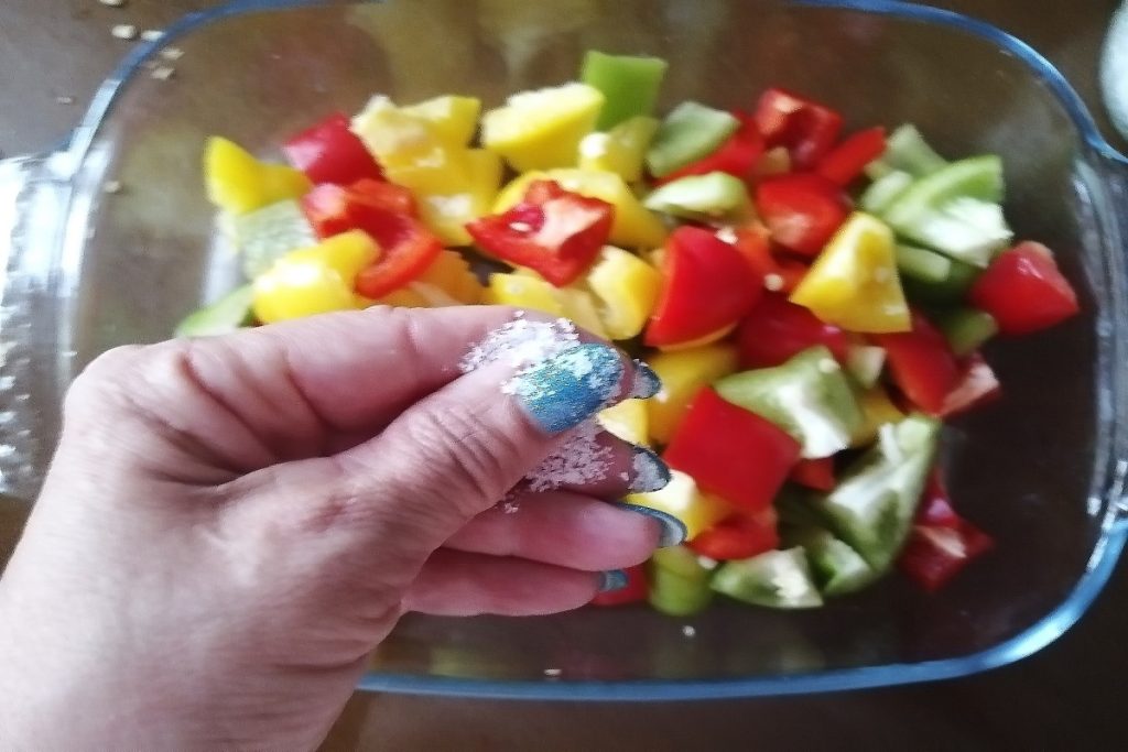 Dans un plat, nous mettons les poivrons en morceaux, assaisonnons avec du sel, du curcuma et les 3 cuillères à soupe d’huile EVO.