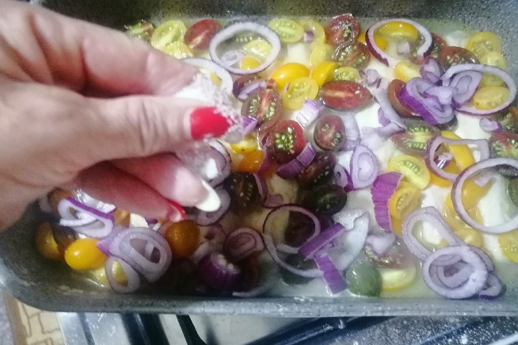 Ajoutez les tomates cerises, l’oignon et les feuilles de basilic, allongez avec un demi-verre d’eau pour continuer la cuisson au four.