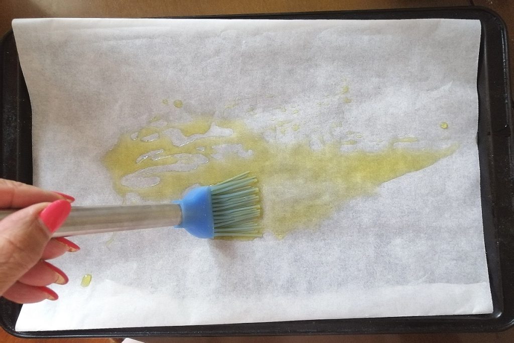 Couvrez un moule de 25 cm x 32 cm avec du papier sulfurisé et badigeonnez la surface d’huile EVO.