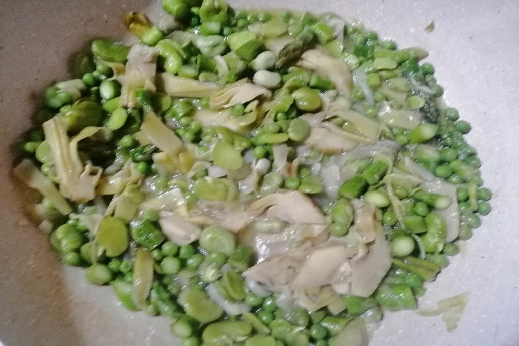 Ajoutez les asperges, faites-les cuire encore 3-4 minutes, avant d’ajouter les petits pois et enfin les fèves.
