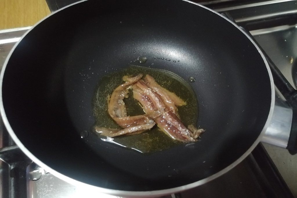 Versez un peu d’huile EVO dans la poêle et ajoutez les filets d’anchois.