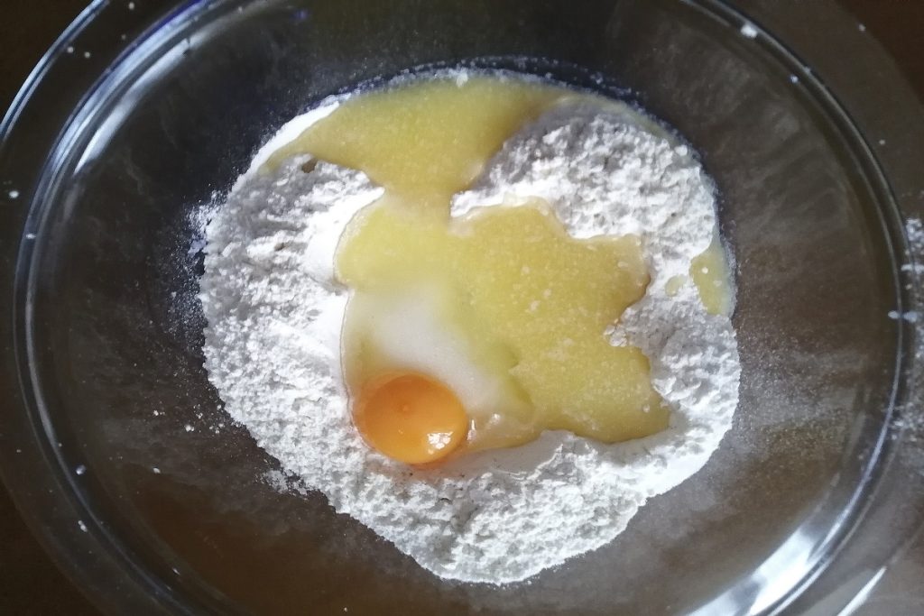 • Versez la farine mélangée avec la levure et au milieu insérez le reste des ingrédients.