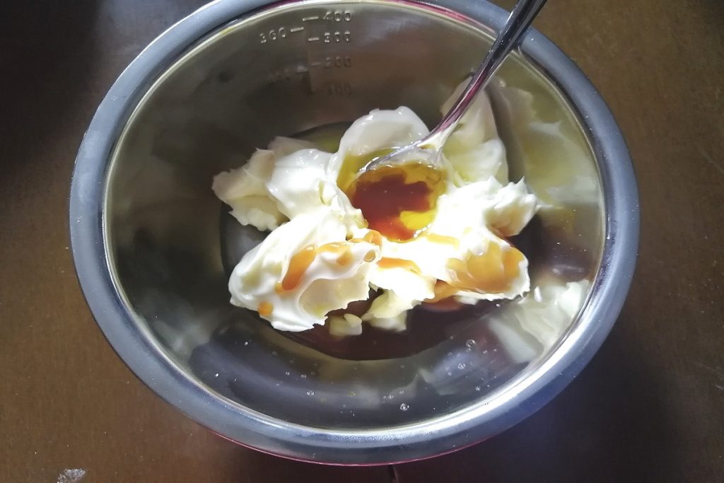 Dans le beurre ramolli, versez l’arôme vanille, l’arôme d’orange et le malt, mélangez tous les ingrédients.