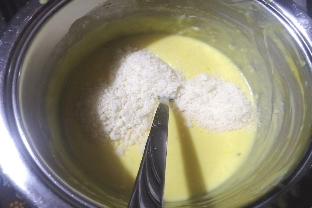 Quand le lait est arrivé à ébullition, versez la pâte et mélangez avec le fouet jusqu’à ce qu’elle épaississe, éteignez le feu.