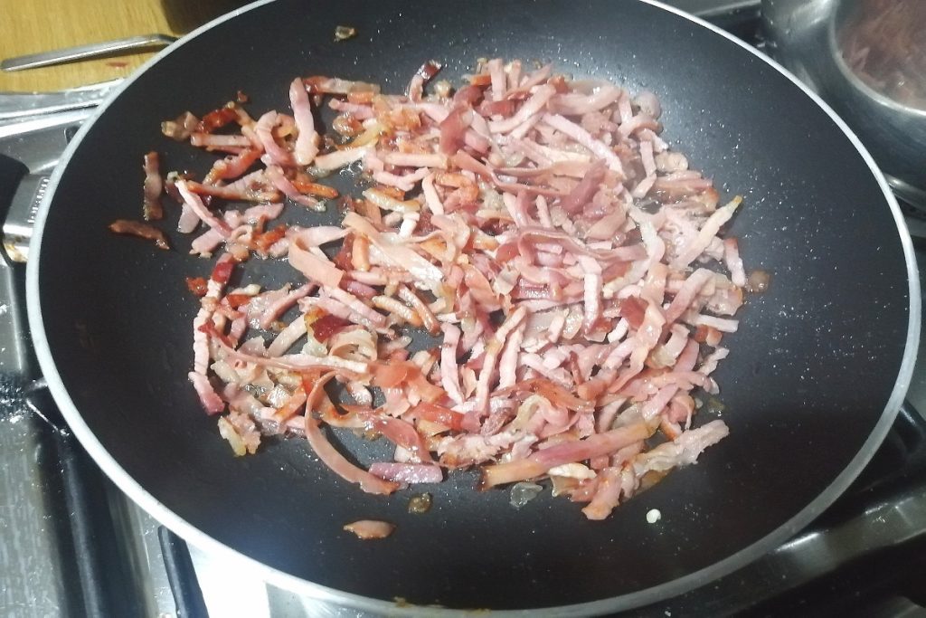 Dans une poêle antiadhésive, versez un peu d’huile d’olive extra vierge et incorporez le speck en bâtonnets.