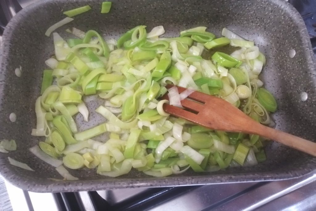 • Dans une casserole, versez de l’huile d’olive extra vierge et le poireau émincé.