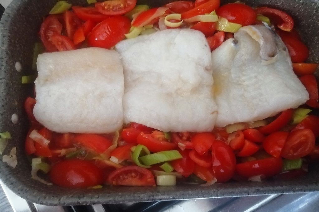 • Ajoutez les morceaux de cabillaud dessalé et déglacez avec le vin blanc, laissez cuire pendant 10 minutes.