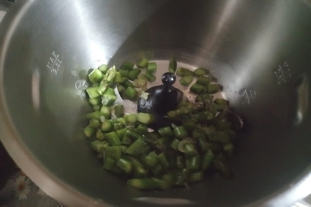 Dans une casserole, versez les 2 cuillères d’huile EVO et l’oignon finement haché, laissez doucement fondre puis ajoutez les asperges coupées.