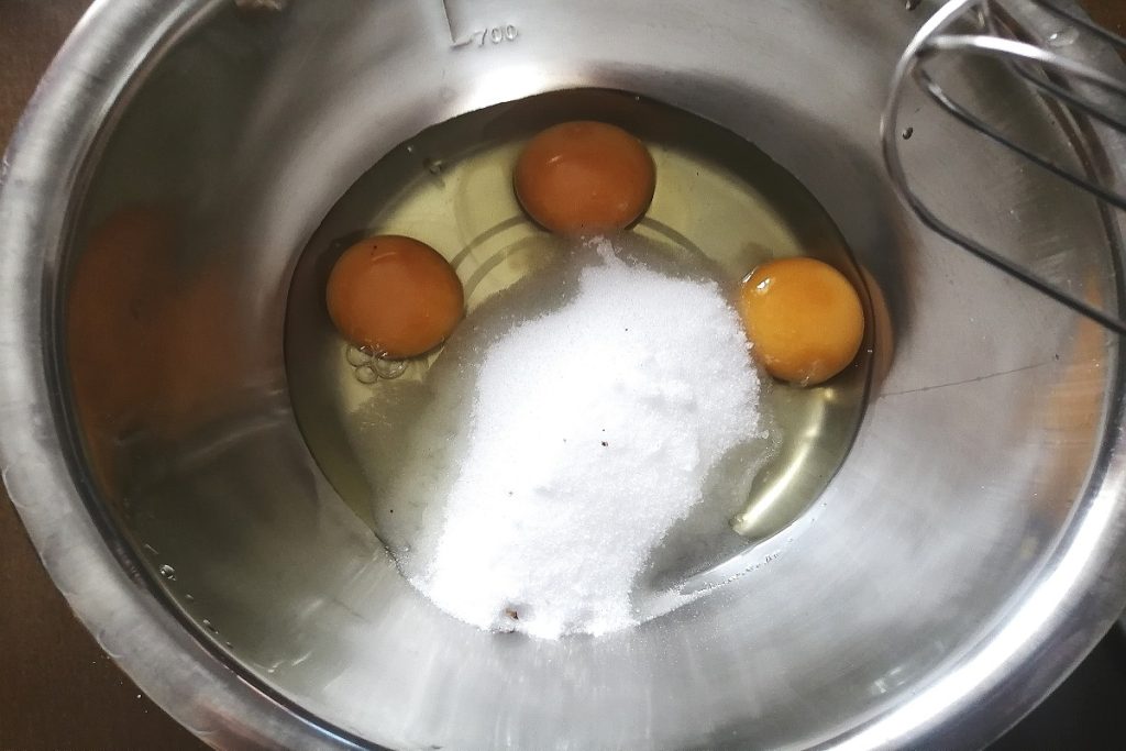 • Dans un bol, versez les œufs et le sucre et commencez à travailler avec le fouet électrique.