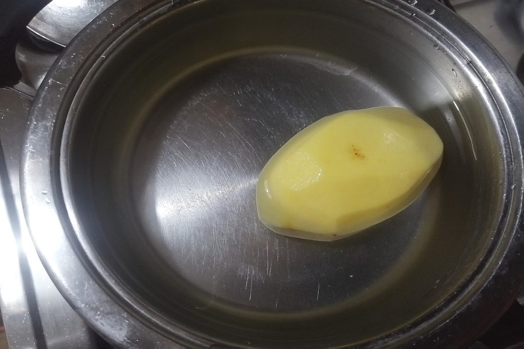 Entre-temps, mettons la pomme de terre dans une casserole avec de l’eau sur le feu pour cuire.
