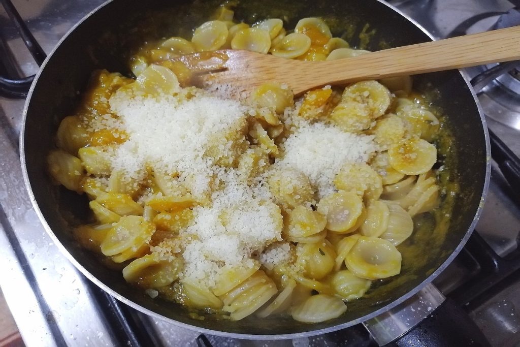 • Égouttez les orecchiette et versez-les dans la poêle avec le condiment, ajoutez le parmesan râpé et mélangez.