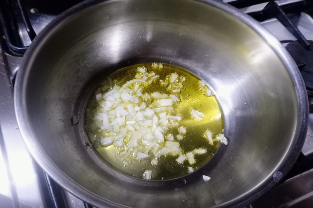 Émincez l’oignon et mettez-le dans une casserole avec de l’huile d’olive vierge extra, faites-le dorer.