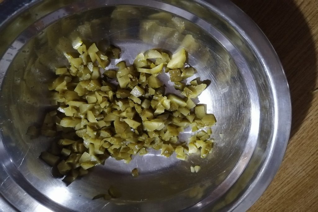 Nous coupons les cornichons en très petits morceaux et les ajoutons aux légumes, mélangeons.