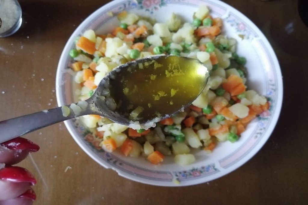 Nous ajoutons les cuillères d’huile d’olive vierge extra et le vinaigre de cidre, mélangeons à nouveau et terminons par l’ajout de la mayonnaise, couvrons de film plastique et mettons au frigo pendant au moins 2 heures.