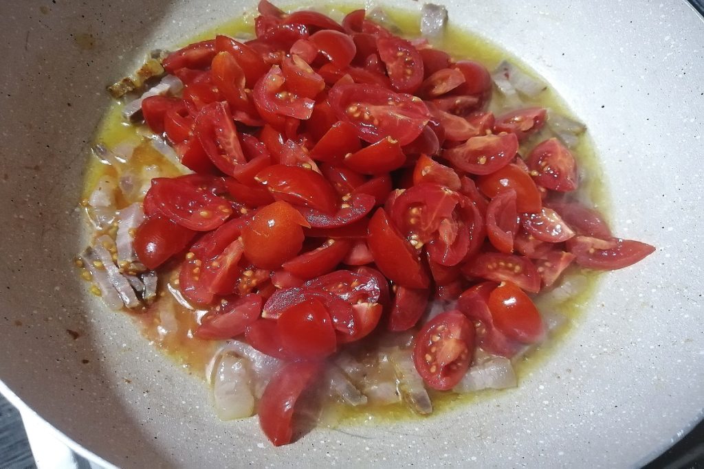 Laissez cuire à feu doux pendant 10 minutes, le temps nécessaire pour que les tomates s’effondrent.
