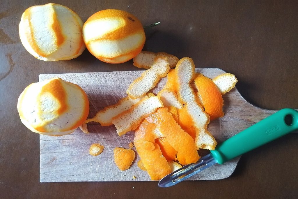 • Coupez finement les zestes des oranges en évitant les parties blanches, réduisez-les en petits morceaux, ensuite épluchez les oranges et coupez les quartiers en dés.