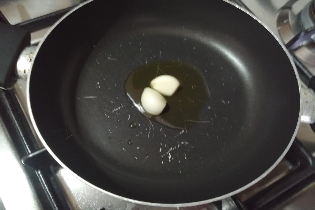 Dans une petite poêle, versez une cuillère d’huile d’olive extra-vierge et une gousse d’ail ; ajoutez les tomates coupées en petits morceaux.