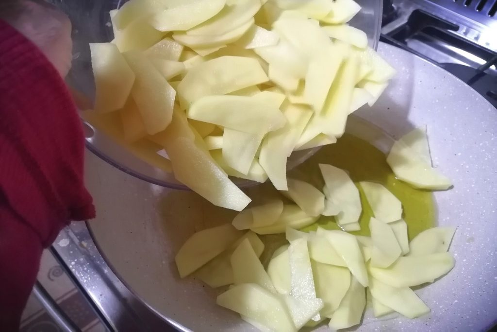 Dans une poêle, versez de l’huile d’olive extra vierge et incorporez les pommes de terre, ajoutez les autres ingrédients : oignon et fèves.