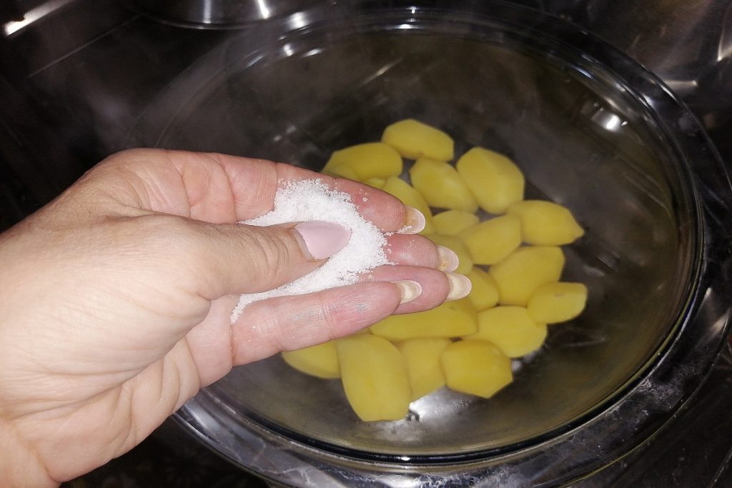 Vous pouvez préparer les pommes de terre nouvelles avec la peau si vous le souhaitez, j’ai préféré l’enlever, dans ce cas, il est préférable d’utiliser des pommes de terre biologiques car la peau, en contact avec le sol, absorbe l’engrais et les traitements chimiques.