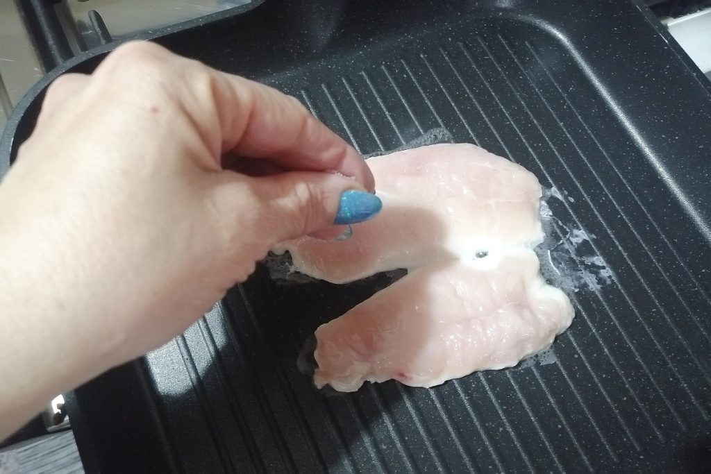 Entre-temps, nous pouvons préparer le blanc de poulet en le faisant cuire sur la grille bien chaude, assaisonnez avec une pincée de sel des deux côtés.