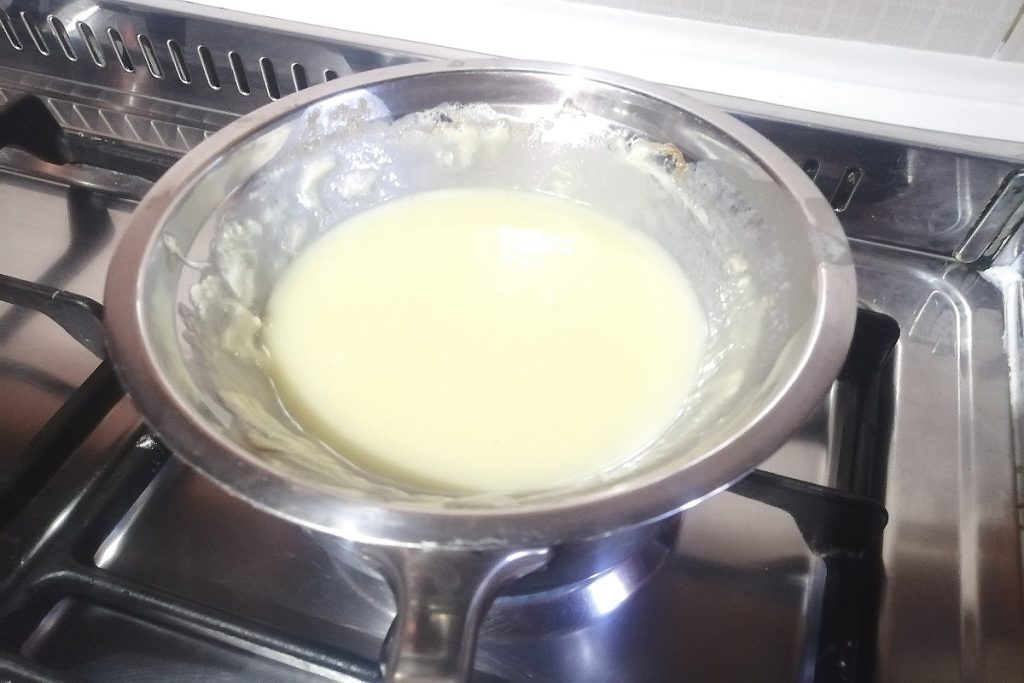 Versez le lait, quelques gouttes d’essence de citron, allumez le feu et portez doucement à ébullition.