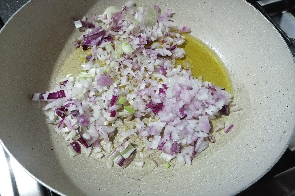 Dans une grande poêle, versez de l’huile d’olive vierge extra et ajoutez les oignons, incorporez les carottes, mélangez et laissez les légumes dorer doucement.