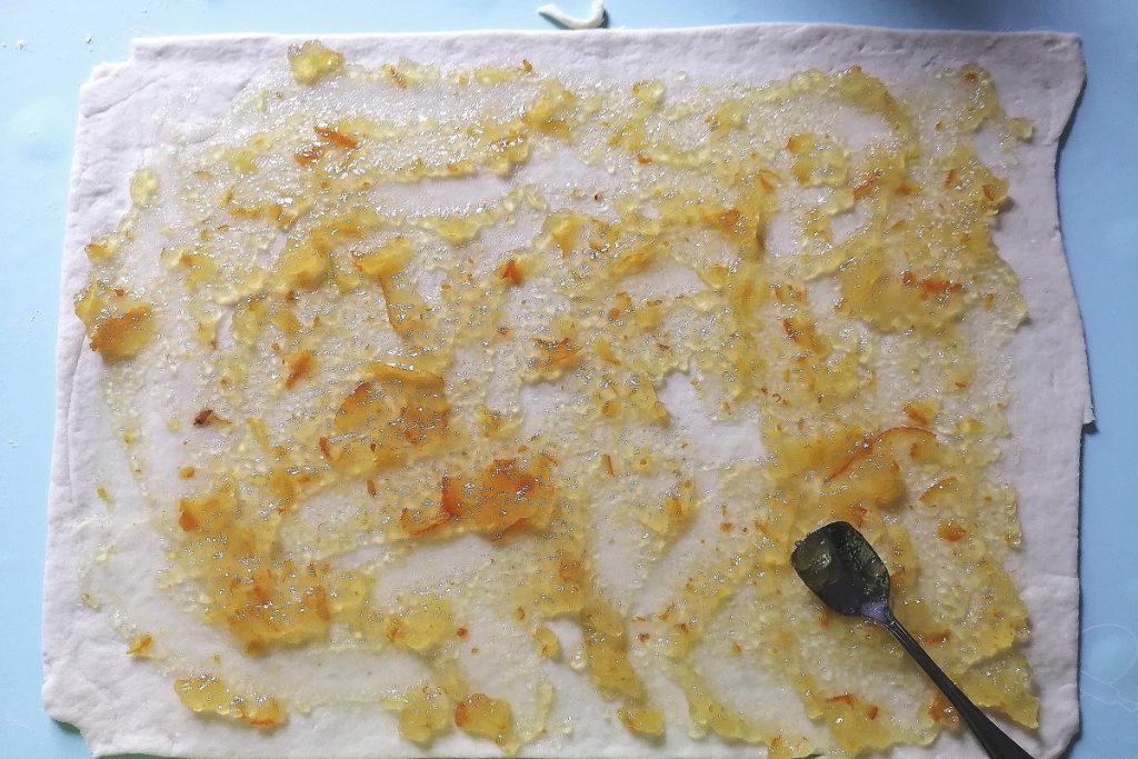 • Étalez la marmelade d’oranges puis parsemez uniformément les cubes de fruits.