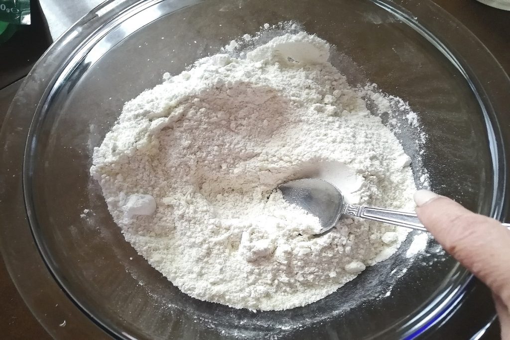 Dans un bol, versez la farine tamisée et mélangée avec la levure, incorporez également le pecorino râpé et mélangez les deux ingrédients avec une cuillère.