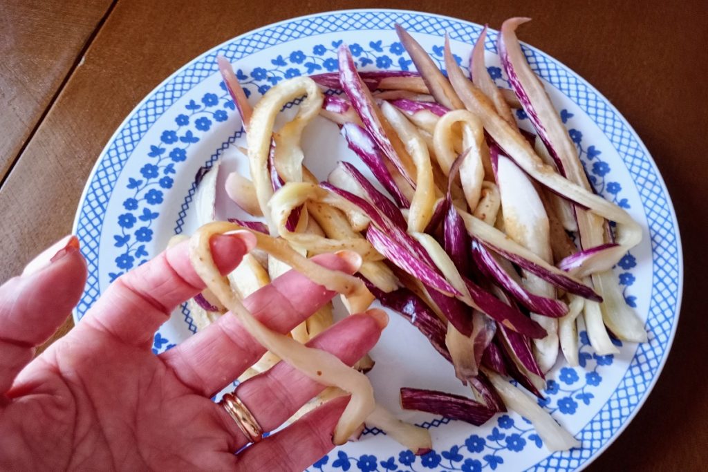 Un plat qui sent l’été, les aubergines coupées en fines lamelles, mises quelques minutes sous sel avant de les frire.