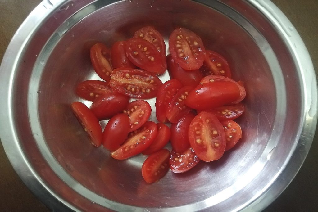 Lavons et coupons les tomates cerises en deux.