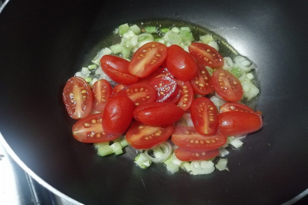 Ajoutons les tomates cerises et assaisonnons avec du sel et de l’origan.
