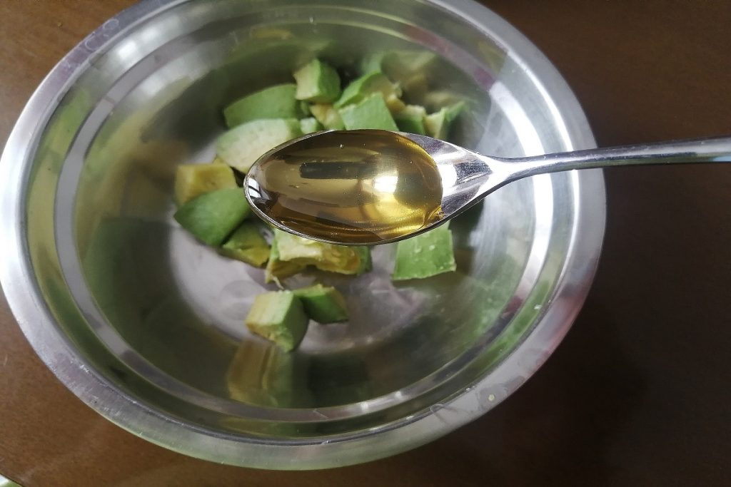 • Épluchez et coupez l’avocat en petits morceaux, ajoutez la cuillère d’huile EVO et écrasez avec une fourchette.