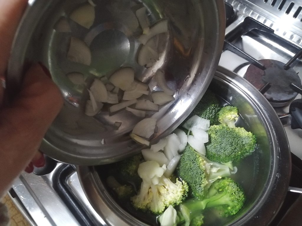 Ajoutez les brocolis et l’oignon, poursuivez la cuisson pendant 15 minutes supplémentaires.
