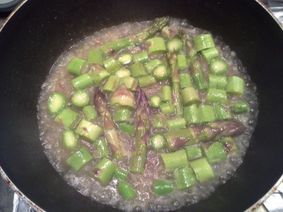 Coupez les tiges des asperges en rondelles, faites cuire les rondelles pendant 4 minutes et seulement deux minutes les pointes, égouttez et plongez dans de l’eau glacée pour arrêter la cuisson et fixer la couleur.
