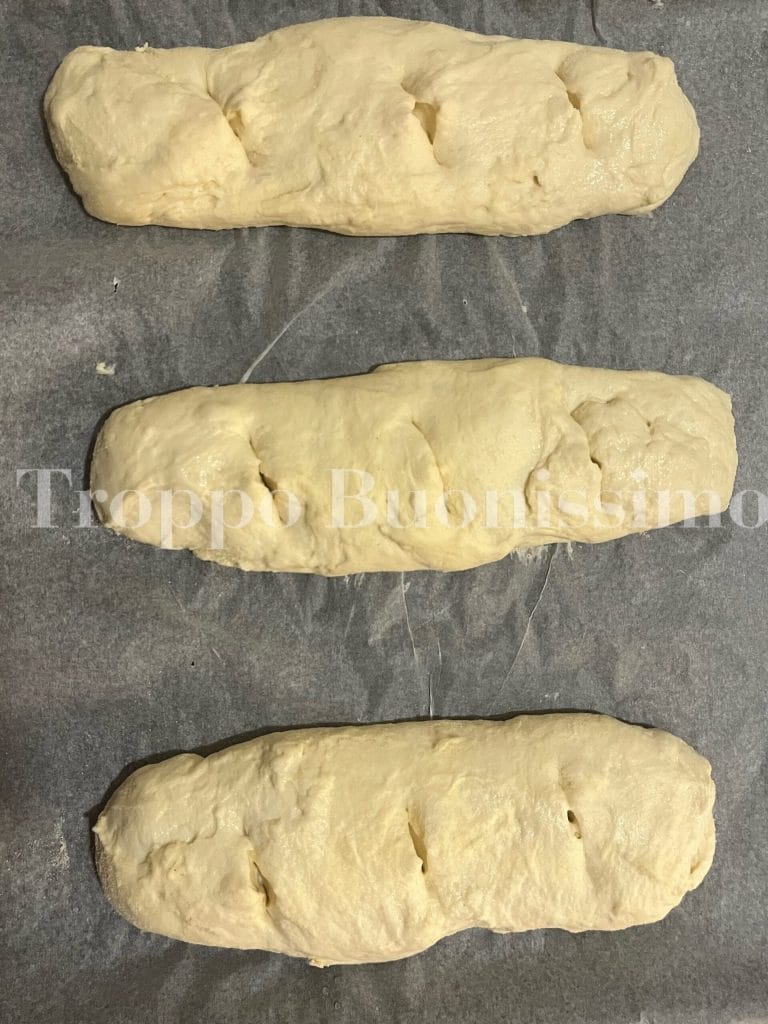 Divise la pâte en trois parties, aide-toi d’une raclette et forme 3 baguettes, en les espaçant bien entre elles.