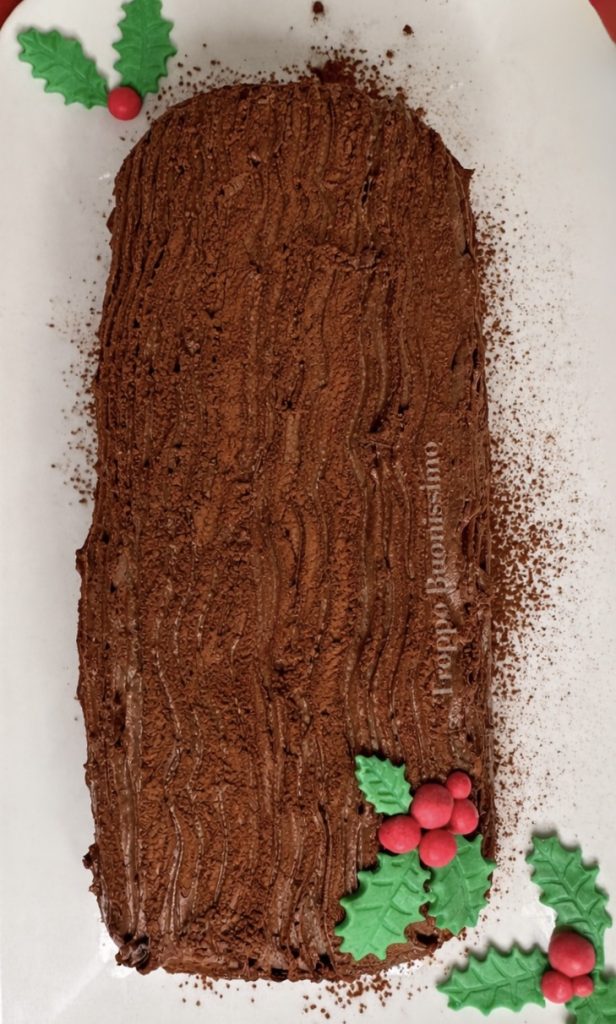 Une fois le temps de repos écoulé, transfère la bûche sur un plat de service. Saupoudre toute la surface de cacao amer et, avec les dents d’une fourchette, crée les classiques lignes pour simuler l’écorce du bois.