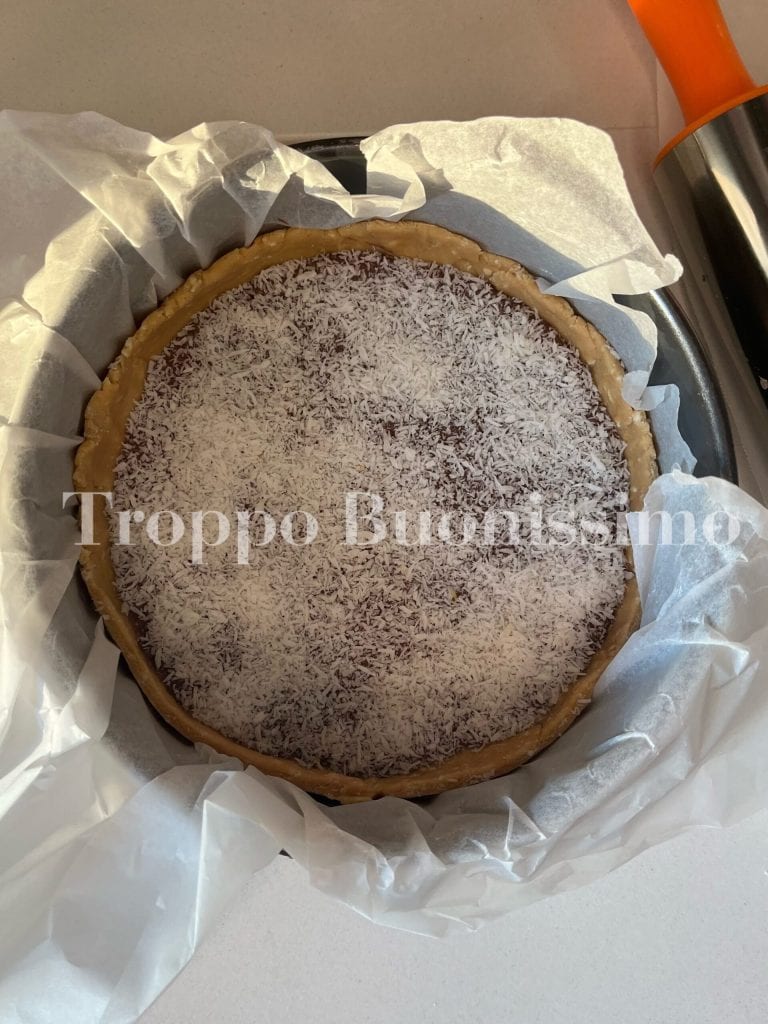 Couvrez avec l’autre moitié de la pâte, une pincée de cacao amer, un peu de noix de coco râpée autour des bords et vous pouvez la servir tout de suite ! Si vous la préférez un peu plus compacte, je vous conseille de la mettre au réfrigérateur pendant au moins une heure, juste le temps de la faire solidifier.
