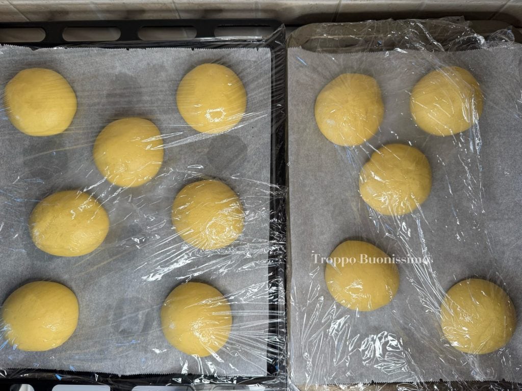 Couvrez à nouveau avec un film plastique et laissez lever pendant 1 heure et demie, jusqu’à ce qu’elles doublent de volume.Maritozzi avant la deuxième levée