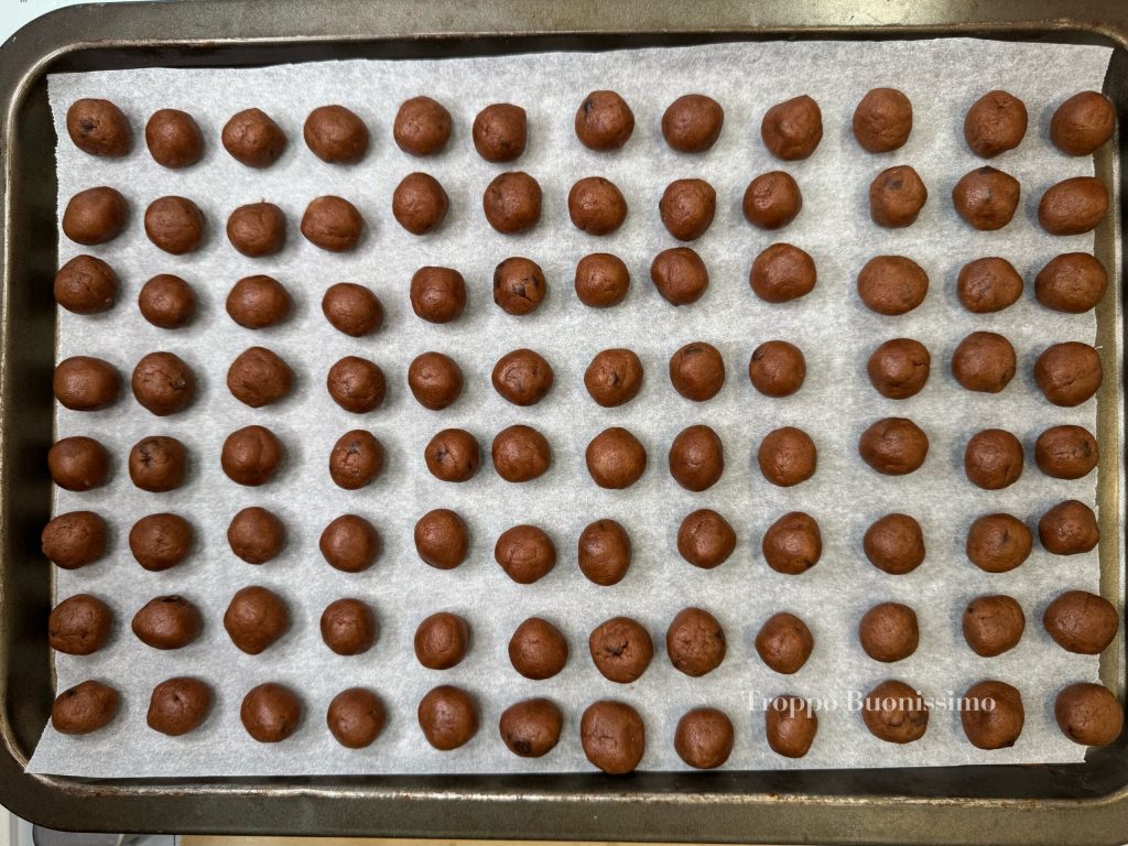 Ajoutez également ici les pépites de chocolat.Prélevez des portions d’environ 5 g et formez des boules avec les mains.