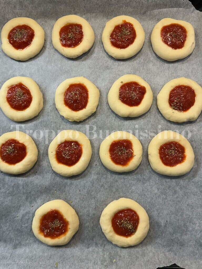 Une fois que la pâte est bien travaillée, formez une boule et placez-la dans un bol légèrement huilé. Couvrez le bol avec du film plastique et laissez lever dans un endroit tiède pendant environ 2 heures, ou jusqu’à ce que la pâte ait doublé de volume. Le temps de levée peut varier selon la température, alors vérifiez la pâte de temps en temps.Lorsque la pâte est bien levée, transférez-la à nouveau sur le plan de travail, formez de petites boules d’environ 30/35 g chacune et placez-les sur une plaque couverte de papier sulfurisé. Laissez-les lever encore pendant environ 30 minutes.