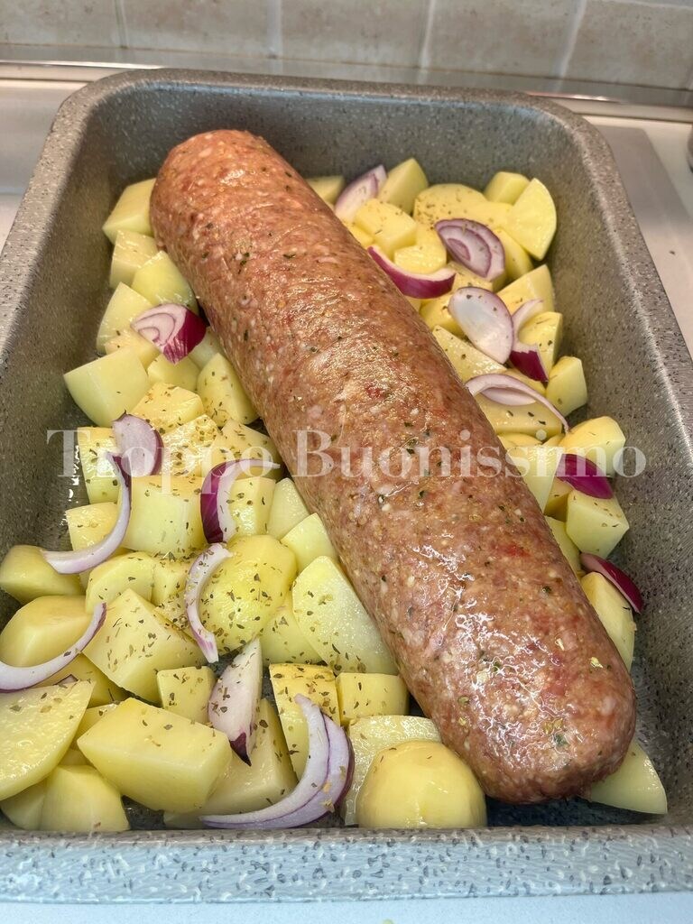 Préparez maintenant les pommes de terre. Épluchez-les et coupez-les en morceaux. Tranchez finement un oignon de Tropea. Dans un plat, mélangez les pommes de terre et l’oignon avec un filet d’huile d’olive vierge extra, du sel et de l’origan à votre goût. Répartissez uniformément les pommes de terre autour du pain de viande placé au centre du plat. Badigeonnez le pain de viande avec un peu d’huile d’olive vierge extra pour obtenir une croûte dorée pendant la cuisson.