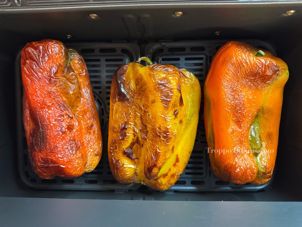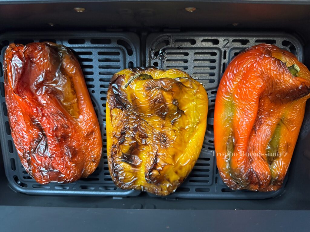 Éteins la friteuse et laisse les poivrons à l’intérieur pendant encore 15/20 minutes : la chaleur résiduelle et la vapeur faciliteront le retrait de la peau.