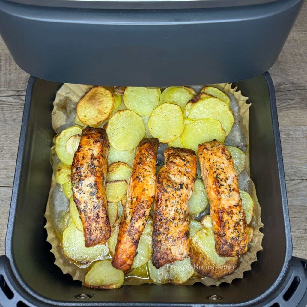 Dispose le saumon et les pommes de terre dans le panier de la friteuse à air sans les superposer. Fais cuire à 190°C pendant environ 18-20 minutes. À mi-cuisson, ouvre et vérifie : tu peux retourner les pommes de terre pour les dorer mieux.