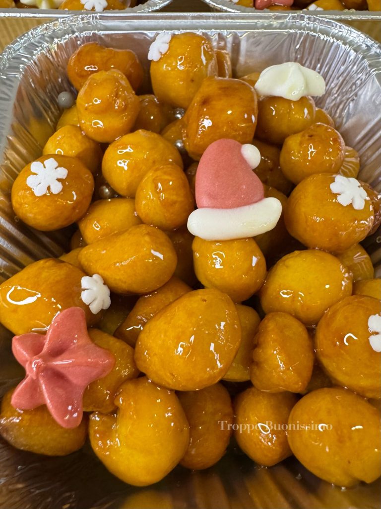 Les struffoli, la cicerchiata et la pignolata sont des desserts traditionnels italiens qui ne peuvent pas manquer sur la table des grandes occasions ! Ces délicieuses boules de pâte frite, enrobées de miel et décorées de petits bonbons colorés, sont parfaites pour célébrer Pâques, Noël, le Carnaval et bien d’autres occasions spéciales.
