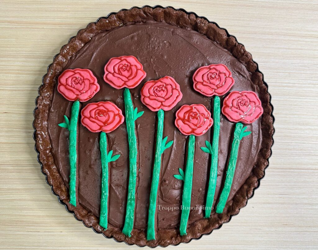 Cette tarte au cacao avec crème de noisettes décorée de roses et pâte à sucre est la recette parfaite à préparer pour la Fête des Mères : facile à faire, mais d’un grand effet grâce aux roses en sucre et au glaçage royal qui la rendent élégante et romantique.