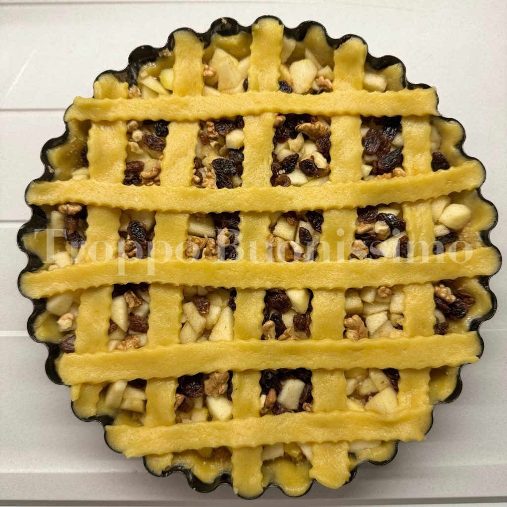 La tarte aux pommes, cannelle, raisins secs et noix est un dessert qui évoque les saveurs de l’automne, parfait pour accompagner une tasse de thé ou comme dessert à la fin du repas. La douceur des pommes se combine avec le jus de citron et le parfum de la cannelle, tandis que les raisins secs, adoucis, ajoutent une note sucrée. Les noix, avec leur croquant, complètent l’ensemble, offrant une texture unique.