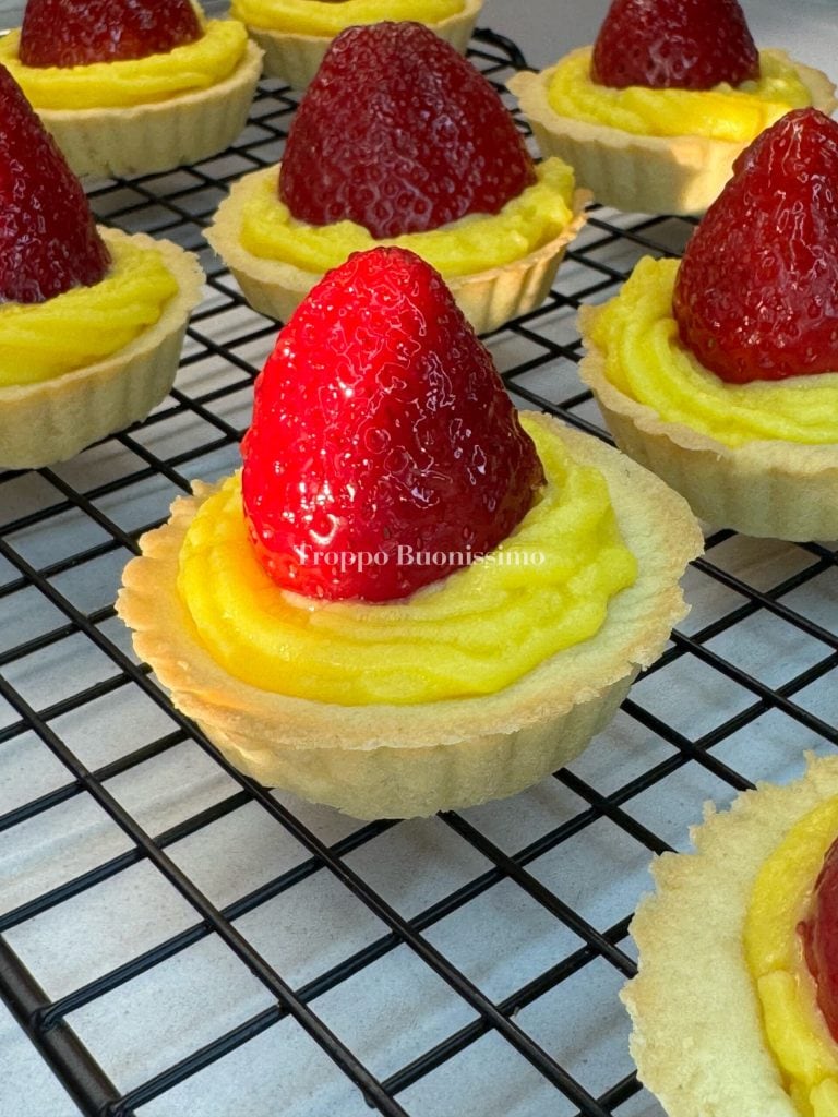 La base friable de pâte sablée s’accorde parfaitement avec la crème veloutée et parfumée à la vanille, tandis que la fraise entière au centre apporte fraîcheur et une touche d’élégance irrésistible.