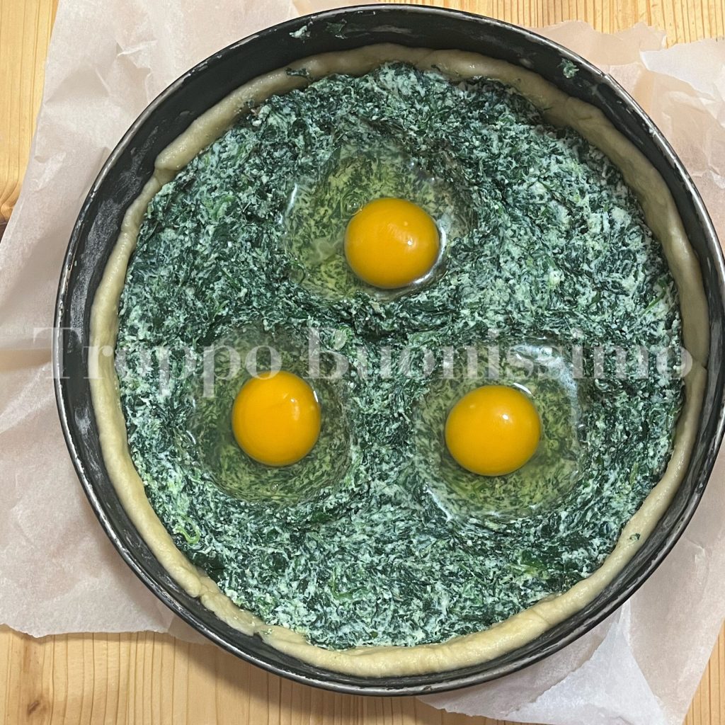 • Versez le mélange sur la base de la tarte, nivelez bien le tout et puis avec une cuillère, créez 3 cavités dans lesquelles vous verserez dans chacune un œuf.