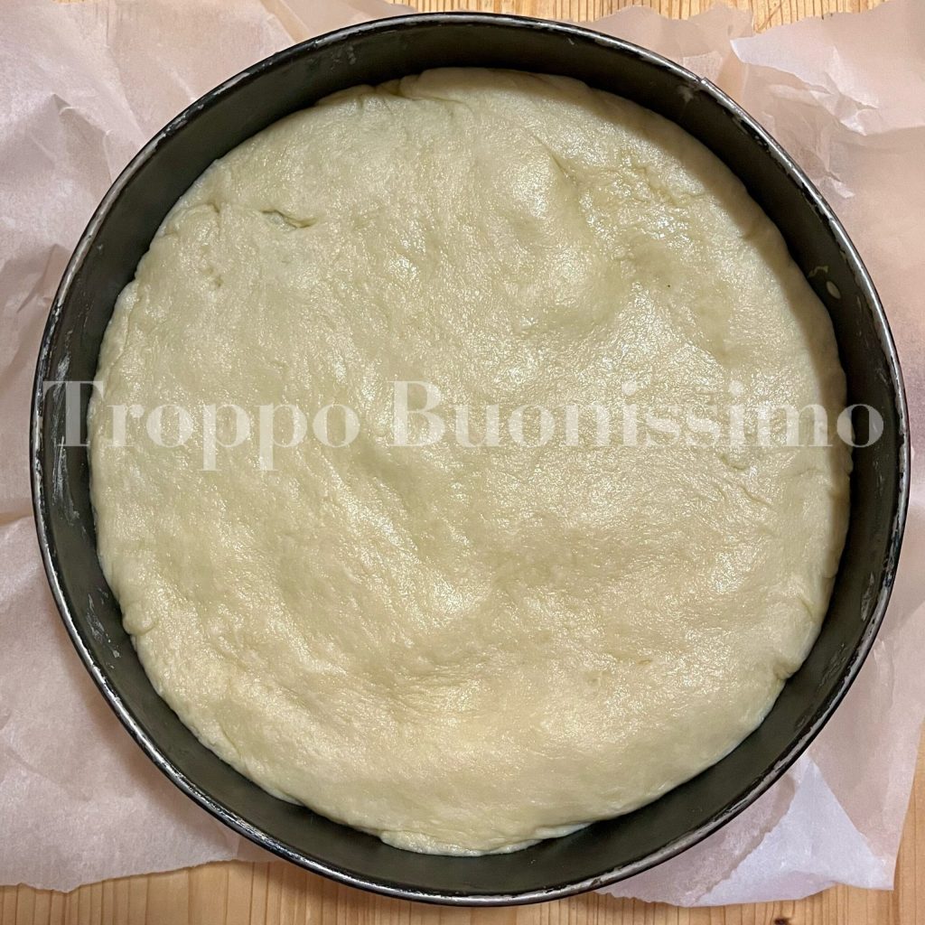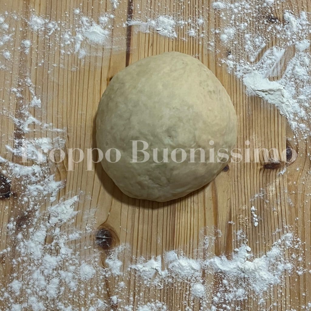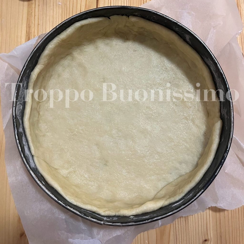 Entre-temps, préparez la pâte brisée : dans un bol ou un robot culinaire, versez la farine tamisée, l’eau, l’huile et le sel. Mélangez bien pour bien amalgamer les ingrédients, ajoutez enfin la levure chimique pour préparations salées et pétrissez jusqu’à obtenir une pâte compacte et élastique.
