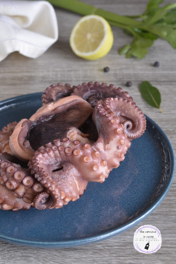 Pour commencer, faites chauffer de l’eau pour cuire le poulpe dans une grande casserole avec à l’intérieur la tige de céleri lavée, les feuilles de laurier et les baies de genièvre. Lorsque celle-ci bout, immergez le poulpe, pendant ce temps nettoyez le poulpe.